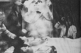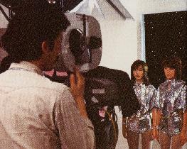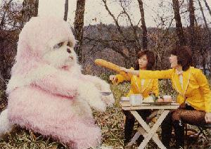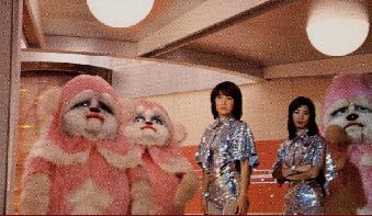 | さて、お話はがらりと変わって、こちら、あるサーカス団のテントの中。ここに、アラスカの氷河で発見された、珍しいモンスターが運び込まれた。ピンクの剛毛におおわれた、この巨大な怪獣の訓練係兼飼育係を命じられたのがミーとケイの二人なのだ。 このモンスター君、図体ばかりでかいくせに、まるでブキッチョ。ミーとケイが、一所懸命に芸を教え込もうとするのに、失敗ばっかりして、まるっきり覚えられなんだ。 「なにやってるんだ、バカ!」 「もっとビシビシしごかなきゃ、ダメじゃないか!」 ひげの団長と、猛獣使いの猪熊は、業をにやして、殴ったり蹴ったりしながらモンスターを猛特訓。おかげでモンスター君、すっかりやつれちゃって、夜のオリの中で涙ポロポロ。これには心優しいミーとケイ、すっかり同情してしまうわけ。 ♪モンスター この私のの可愛い人 モンスター 目をさますのよ モンスター さあお前の出番なのよ モンスター 満月だわ ワーオ ワオ ワオ・・・・・ 次の朝、オリからモンスターの姿が消えているのが発見され、サーカス団は大騒ぎ。団長と猪熊は、すぐにジープで追跡をはじめた。 モンスターを、ワゴン車に乗せて連れ出したのは、もちろんミーとケイ。2人とモンスターの間には、もうすっかり心がかよい合っていた。モンスターの言葉は、不思議な発音でわからないけど、2人の言うことは、相手にちゃんと通じるらしい。 やがて、団長たちのジープが追いすがってきた。ケイがハンドルを握るワゴン車は、スピードをあげて必死に逃げる。山道を、田んぼの間の道を、峠を、ワゴンとジープの手に汗にぎる追いかけっこ! 突然、ワゴン車がストップしてしまった。 「たいへん、ガソリンが切れちゃったわ!」 そこは湖のほとり。向こう岸には、富士山が白銀に輝いている。モンスターはそれを見て、狂ったように何かわめいていた。でも、ぐずぐずしちゃいられない。団長たちは、すぐ後ろまで迫っているのだ。 ミーと、ケイは、岸につないであるボートを見つけると、いやがるモンスターを押し込んで、湖に漕ぎ出した。団長たち、悔しがること。 ホッとしたのもつかの間、モンスター君、何を思ったか急にボートの上で立ち上がり、空に向かって、不思議な歌をうたい出した。ボートはバランスを失って、ひっくり返りそうになる。 「モンちゃん、動かないで!」 「あっ、もうダメ・・・・・沈んじゃう!」 2人が悲鳴をあげたとたん、空の一角がピカリと光ったかと思うと巨大な銀色の円盤が、空から舞い降りて来たのだ。 「UFOだ!」と、岸辺で団長たちが驚き慌てている間に、UFOはボートを包み込むように着水し、すぐにまた飛び立った。 あとには波立つ湖の水面が残るばかり。 ミーとケイがハッと気がつくと、そこはピカピカ光るUFOの中。そばにはあのモンスターが、ニコニコしながら立っているではないか。 「モンちゃん、あなたは宇宙人だったのね」 「そうです。ぼくは、パラド星人です」 なぜかモンちゃんは、ちゃんと言葉もしゃべれるようになっていたのだ。窓から外を見ると地球がぐんぐん遠去って行く 「ミーちゃん、ケイちゃん、ぼくと一緒にパラド星へ行きましょう。地球は野蛮で危険な星です。いまに戦争が起きて、全滅するでしょう。パラド星は平和で美しい星です。2人ともきっと気に入りますよ」 ♪手を合わせて 見つめるだけで 愛し合える 話も出来る くづけするより 甘く ささややき聞くより 強く 私の心をゆさぶるあなた・・・・・ モンスター君の強いすすめで、パラド星へ行くことを決定したミーとケイ。そこでさっそく、“パラド美人”になるための手術が行われた。体中に包帯を巻きつけられ、大きな注射を打たれる。 そして、ミーとケイは、影も形もないないのだ。手術が失敗して、2人は透明人間になってしまったのだ。 ♪まさかと思っているのでしょうが 実は 実は私 透明人間なのです。 ショック ショック・・・・・ 手術をし直すというモンスターの申し出を断わって、2人は地球へ戻してもらうことにした。それからのミーとケイは、いったいどうなってしまうんだろうね? ♪世間を騒がす不思議なことは すべては透明人間なのです・・・・・ ♪この世の奇跡と言われることは すべては透明人間なのです・・・・・ |   |